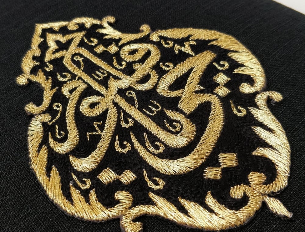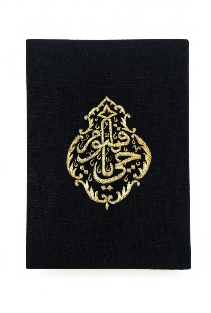 مصحف مكة متوسط القياس ,مُغطى بقماش الكتان الأسود ،ومزين بتطريز جملة (ياحي ياقيوم) (يارحمن يارحيم)